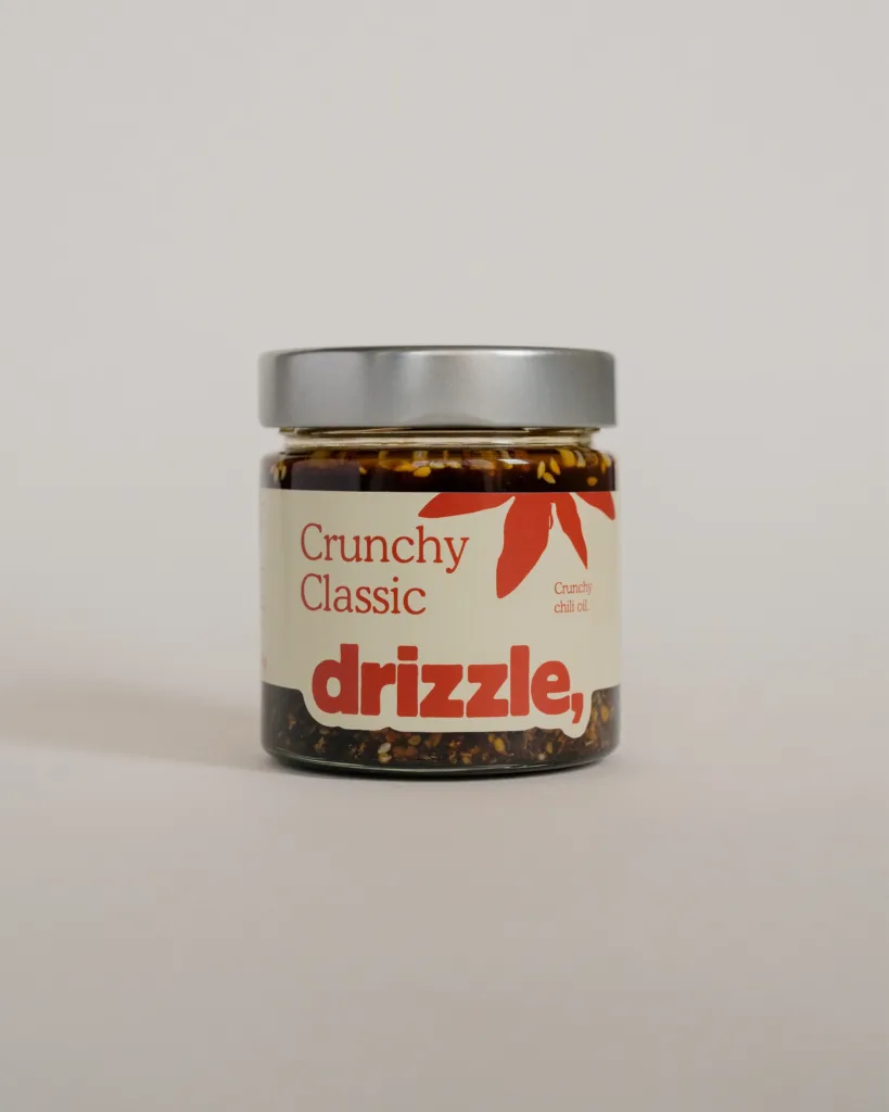 Our classic crunchy chili oil, ideal for everyday use. Fried garlic and onion deliver a delightful smoky crunch. The carefully curated spice blend, crafted in-house, features chipotle flakes and star anise. Szechuan pepper adds a hint of citrus, while balsamic vinegar strikes a perfect sweet-and-sour balance. Fun fact: the rapeseed oil is cultivated in the Green Belt around Brussels. The Crunchy Classic is your new must-have food topping.