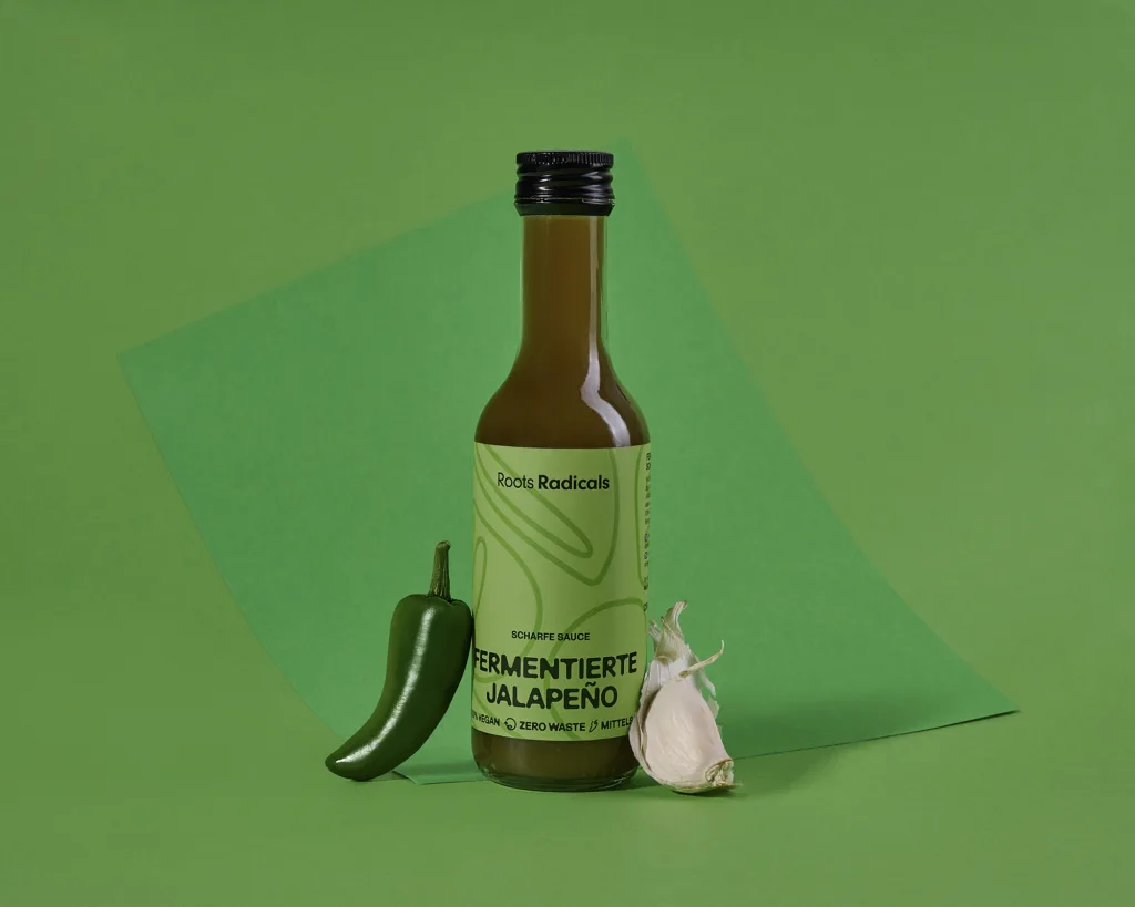 As a zero-waste brand committed to the circular economy, Roots Radicals upcycles the jalapeño pulp to ferment green tomatoes for another signature product, while the garlic peels are transformed into our flavorful Baked Garlic Peel Salt.